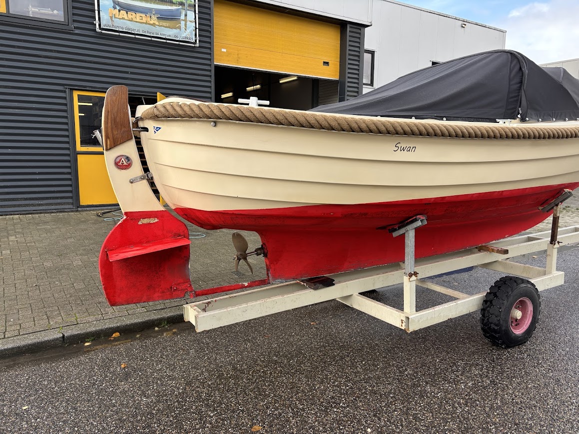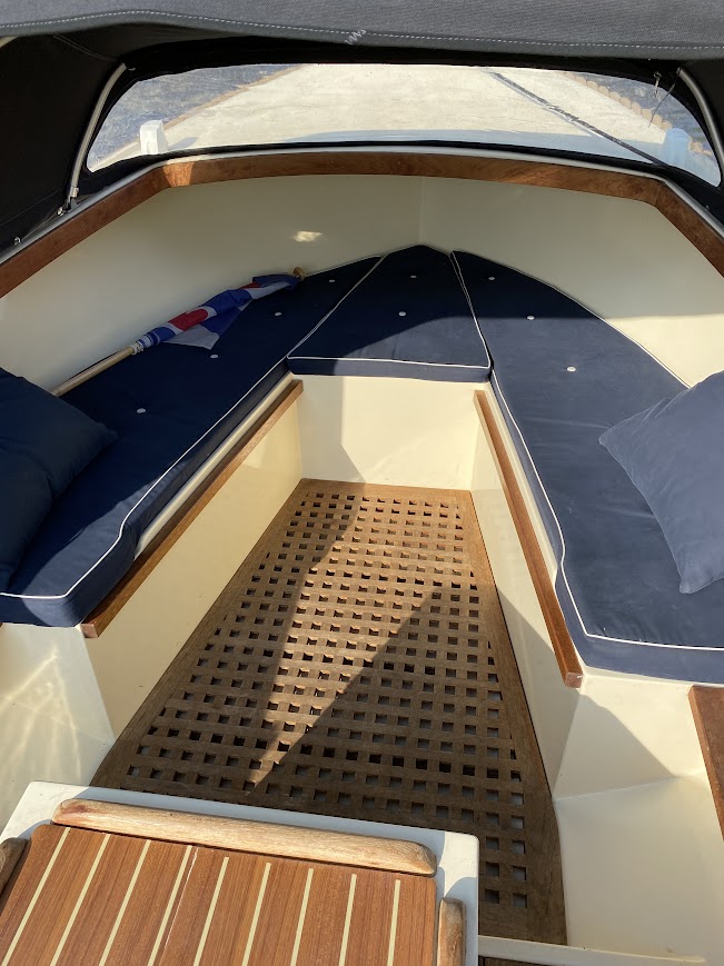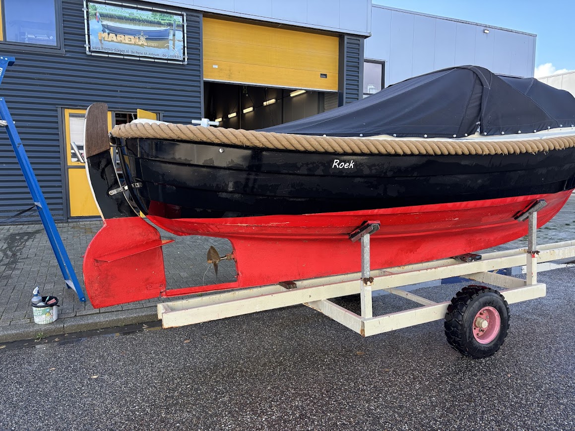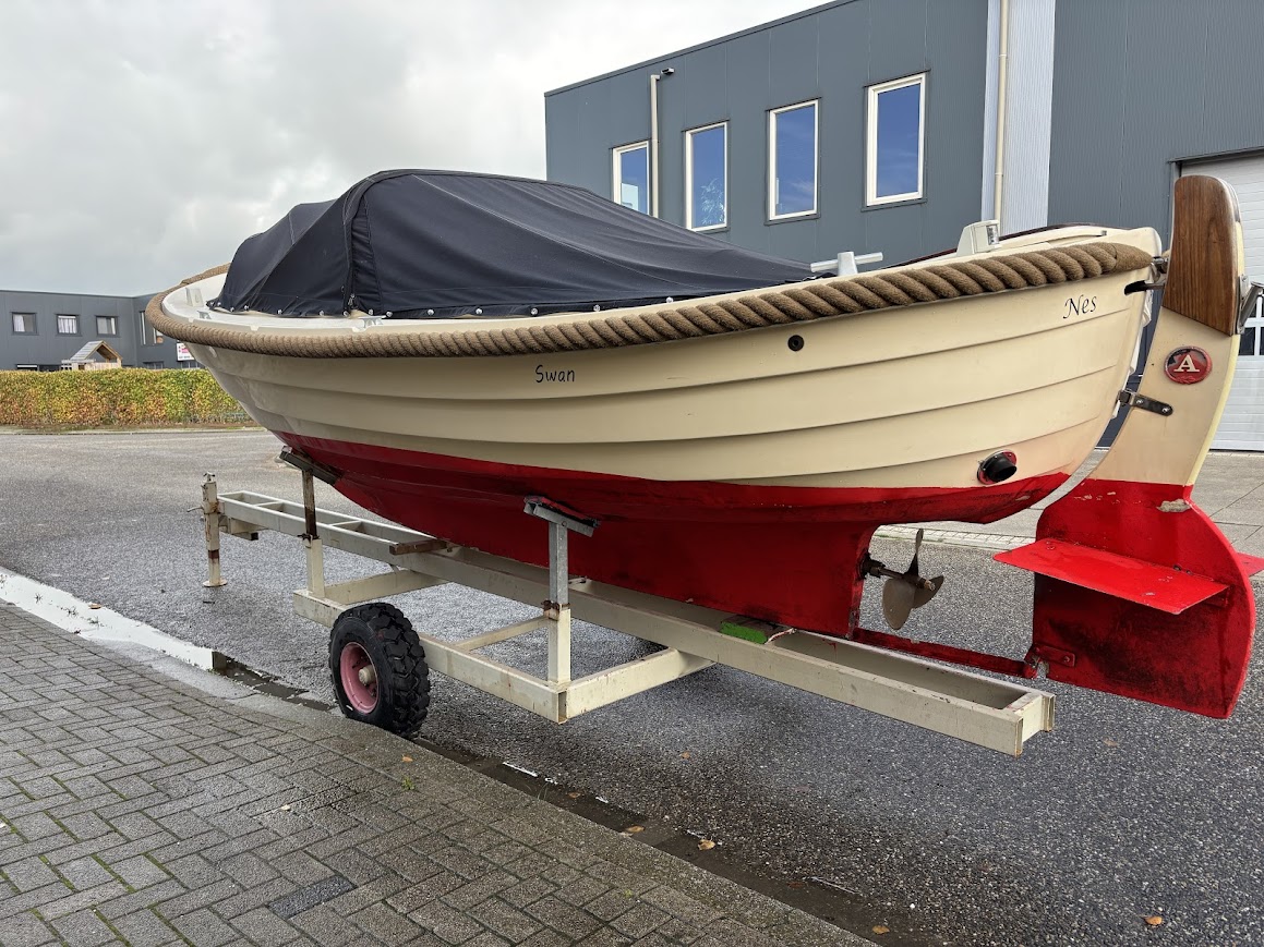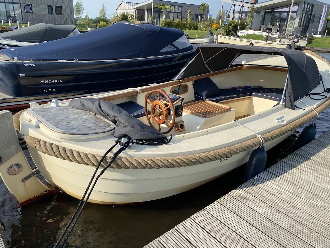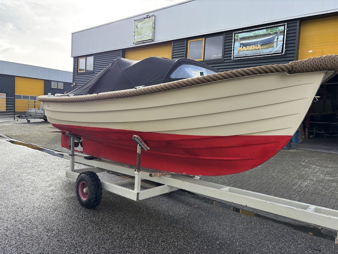 Dikke kabelaring met kopleguaan, grote brandstoftank, kussenset eventueel met zonnebed, massief teak blokroosters, Radio met bluetooth, dieptemeter. Zeer stabiele sloep met krachtige goed onderhouden motor.
