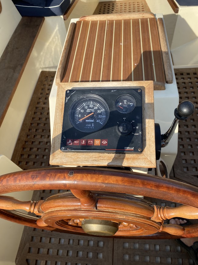 Dikke kabelaring met kopleguaan, grote brandstoftank, kussenset eventueel met zonnebed, massief teak blokroosters, Zeer stabiele sloep met krachtige goed onderhouden motor.