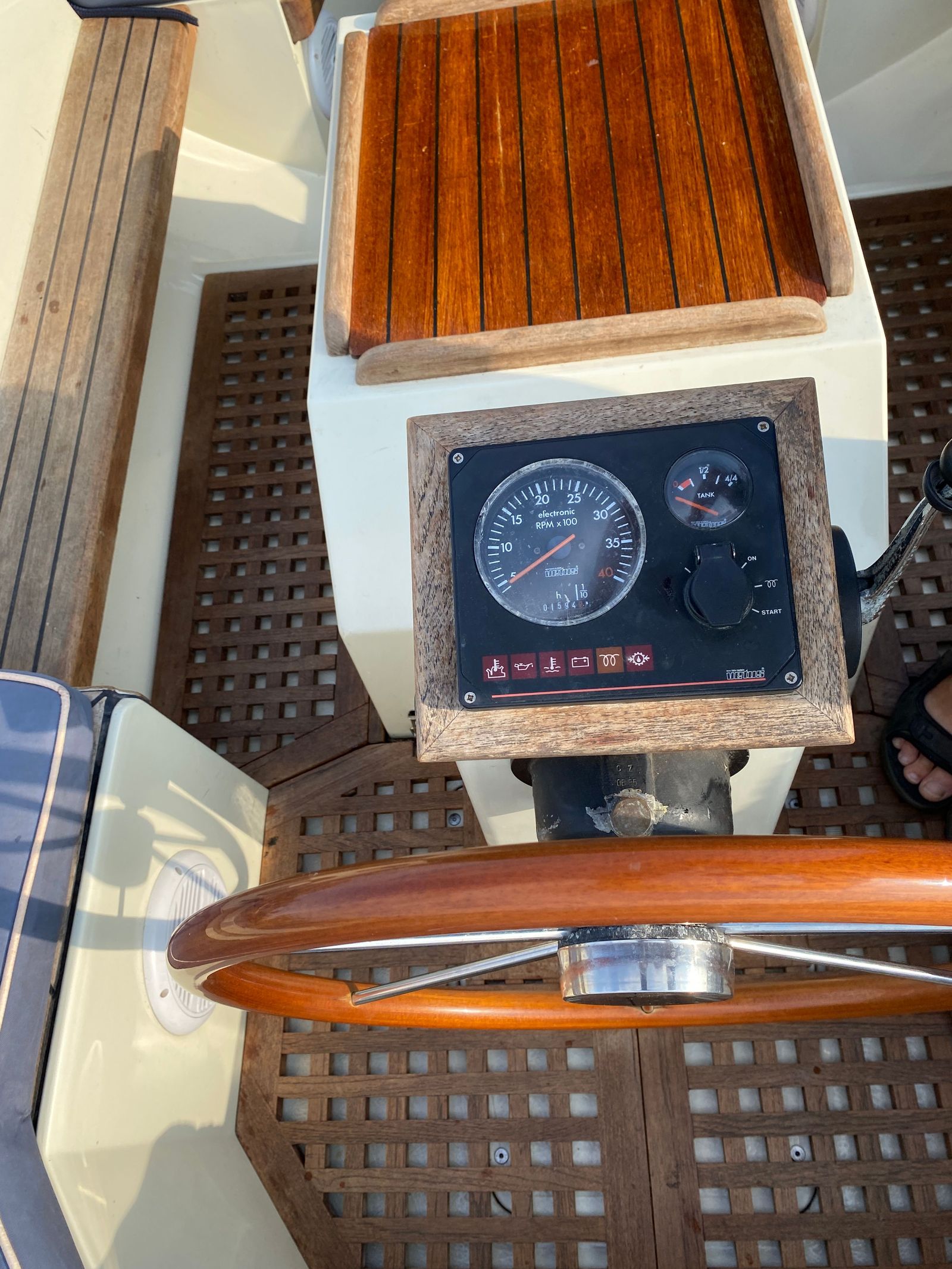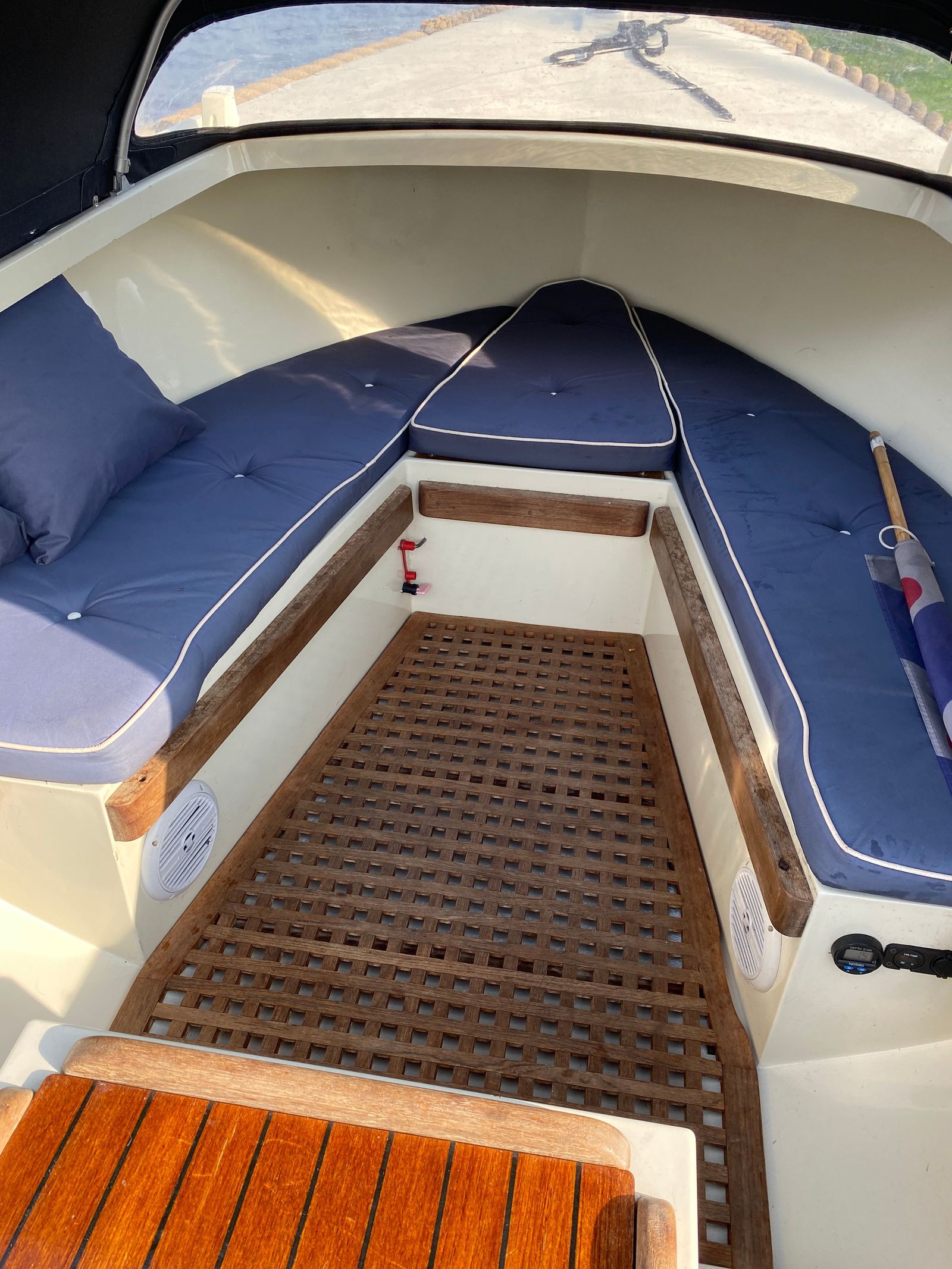 Dikke kabelaring met kopleguaan, grote brandstoftank, kussenset eventueel met zonnebed, massief teak blokroosters, Zeer stabiele sloep met krachtige goed onderhouden motor.